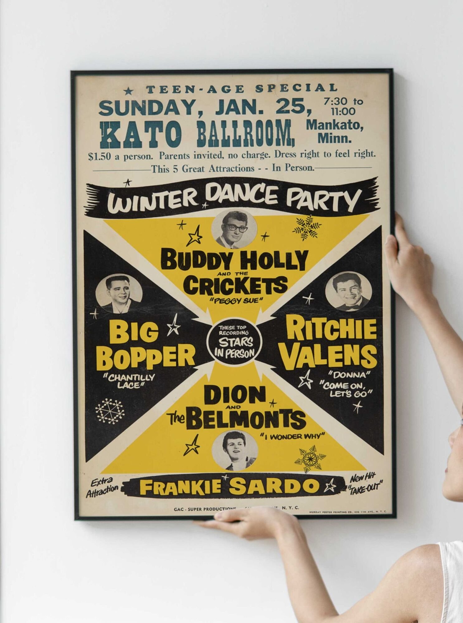 1959 Buddy Holly & The Crickets Poster – Winter Dance Party Concert Print, Vintage Rock and Roll Memorabilia