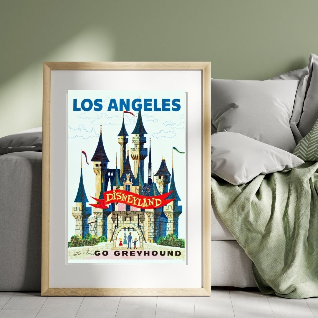 Vintage Los Angeles Disneyland Poster – Greyhound Bus Travel Advertisement Print for Mid-Century California Tourism Fans
